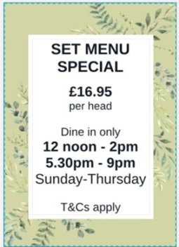 You may treat your club to our Sunday - Thursday £16.95 set menu meal deal between 5.30 pm - 9.00 pm; or book a home delivery for outdoor catering service. We cater upto 500 people+ (approx).